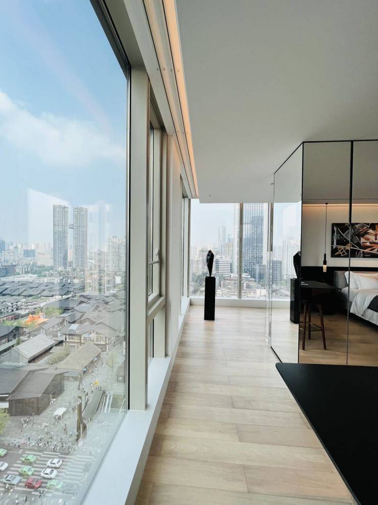 2. 视野无敌:155m地标建筑,270°全景落地窗,高楼层直瞰太古里繁华+大慈寺静谧,夜景灯光秀在家看,主城区核心视野无对手