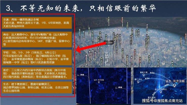 远大海湾云锦地处天府大道右侧800米中核区,高新区的发展中轴,城市主轴线、CBD中心,是拥有众多不可复制的资源叠加区域,达到了一步一地标的壮观景象。双子塔、五粮液演艺中心、环球中心、SKP购物中心、欧洲中心、希尔顿酒店、一带一路大厦等等,而站在本项目云端,可将所有地标,尽收眼底!这就是李嘉诚口中的地段、地段、还是地段!