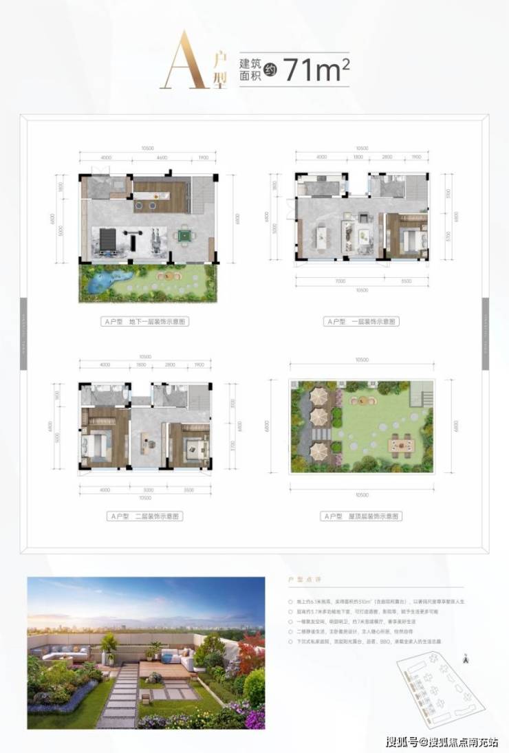 ### 一院藏品质 实力国企精工匠造四川振兴集团,作为省政府直属大型重点骨干企业,以十年匠心赋能区域发展,铸就卓越品牌实力。于南天府之上,精心打造一方和院,敬献层峯人士。### 一院藏实惠 超大赠送空间建面约41 - 76㎡的坡地并排和院,拥有难得一见的奢阔空间。最大实得面积约294㎡(含庭院和露台面积),最大赠送庭院面积约40㎡,最大赠送屋顶花园面积约68㎡,单层层高约6.1米,买一层得四/五层,且0公摊。户型方正大气,格局明朗,可随心打造为高端会所、民宿、私厨、轰趴馆、办公场所等,满足生活的多种想象,成就精致私人天地。户型解析:户户配备私家入户花园,屋顶设有阳光大露台,还有下沉式庭院空间(地下室),让居住者回归有天有地有院子的理想庭院生活。