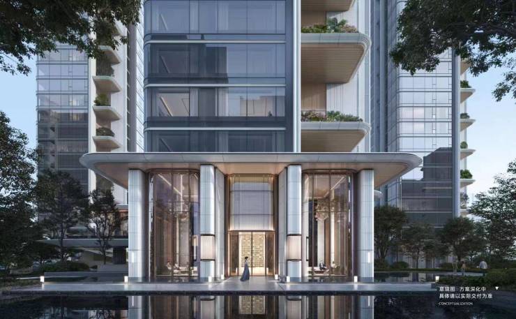 4.建筑设计精美:建筑线条挺拔流畅,主立面采用蓝灰玻璃、浅色铝板、石材等材质,顶部设计钻石塔冠及线条泛光效果,现代感十足。主入口大门宽约72米,采用多层石板榫卯嵌套工艺,辅以“揉石成缎”石材造型,极具仪式感。
