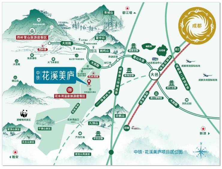 中铁花溪美庐位于四川省成都市大邑县花水湾镇武城街172号,地处国家级旅游度假区——花水湾度假区的核心位置。这里不仅自然风光旖旎,而且人文资源丰富,气候宜人,是远离都市喧嚣、享受山野生活的绝佳之地。花水湾度假区以其独特的温泉资源和丰富的自然景观吸引了大量游客,2023年游客量更是达到了131.3万人次,充分显示了该区域的强大旅游吸引力
