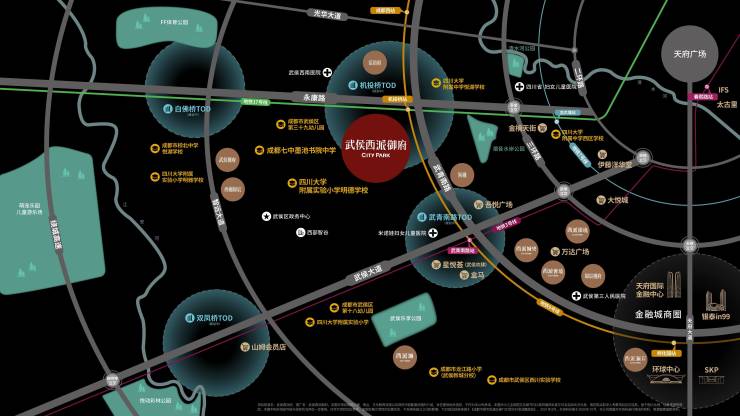 交通方面:这里构建起了三纵三横四轨 TOD 立体交通网络。交大路、金牛大道、蜀汉路,三纵则是三环路、二环路、一环路,共同形成了便捷高效的环状交通体系。而 2 号线、6 号线、7 号线、27 号线这四轨的覆盖,更是让居民的出行变得更加迅速高效。