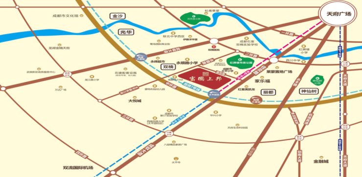 环境:在离项目约 800 米到 3 公里范围内有红牌楼市政公园、丽都公园、浣花公园以及规划中的商务生活公园,为居民提供了休闲散步、运动健身的好去处。