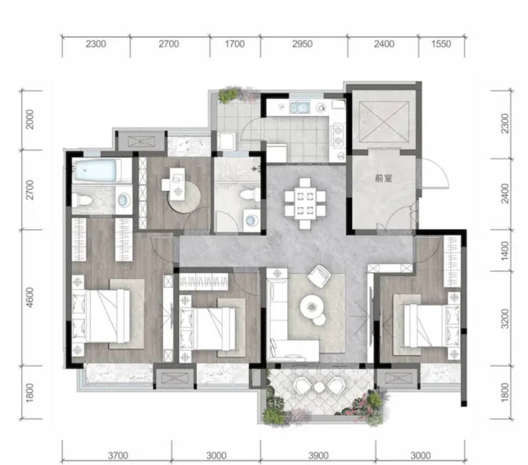 核心亮点:4 室 2 厅 2 卫布局,南北通透,客餐厅与阳台一体化设计,实现阳光与空气对流;朝南主卧开间 3.7 米,配备独立衣帽间与卫生间,满足隐私需求;双套房三卫设计(含长辈房独立卫浴),适配三代同堂家庭,得房率约 103%-107.9%,空间利用率超高;