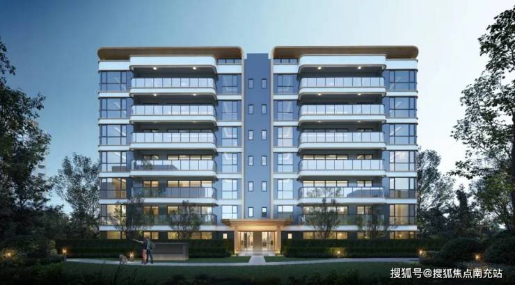 ■ 建筑美学现代简约风格的外立面设计,超大玻璃幕墙占比搭配蓝灰色调,香槟金色铝板线条与高级灰涂料形成优雅对比。特别值得一提的是,项目连建筑背面都经过精心设计,标配全景电梯与入户光厅,实现全方位的美学呈现。