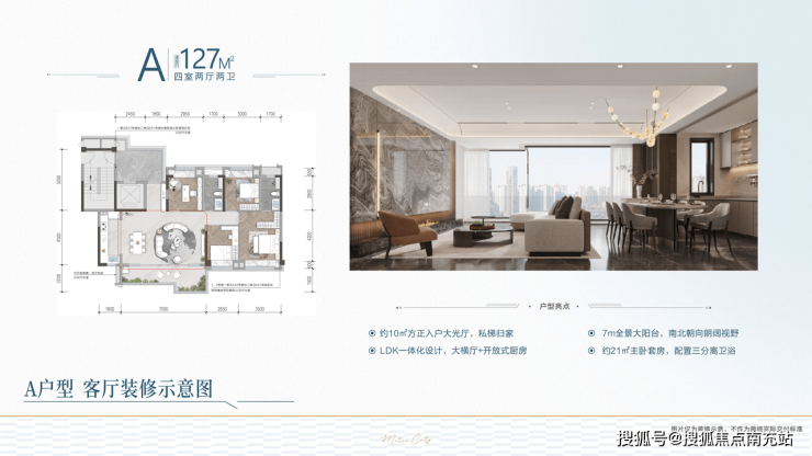 建面127㎡四室两厅两卫:- 纯板式格局,南北通透- 独立玄关系统- 约7米观景阳台(连通客厅)