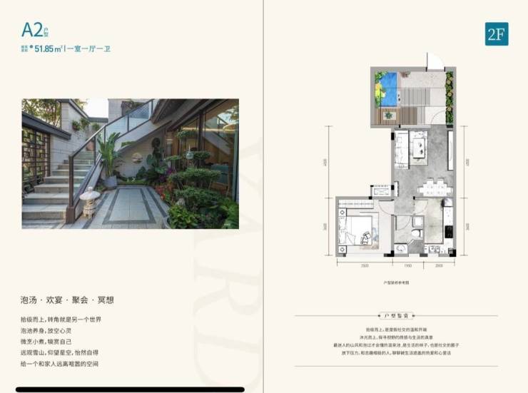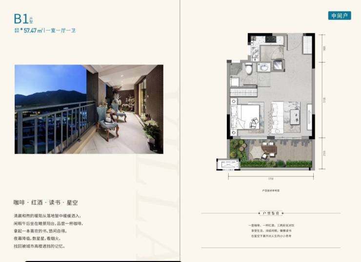◼ 采用一室一厅一厨一卫布局,配备5.7米景观阳台