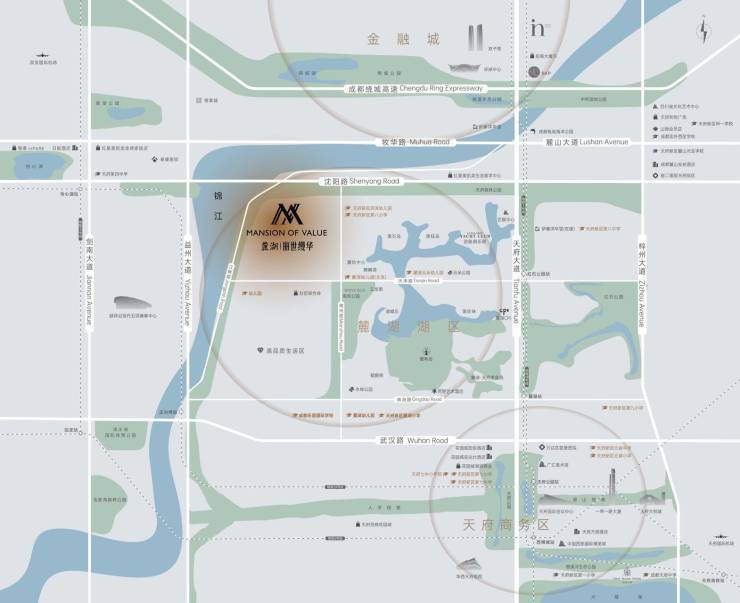 超百万方的世界级商业版图,约5.5万㎡麓坊、约35万㎡麓湖水镇(规划建设中)、约20万㎡怡心湖银泰城(建设中)、约30万㎡天府大悦城、约25万㎡天府和悦广场、约29万㎡天府招商花园城等。