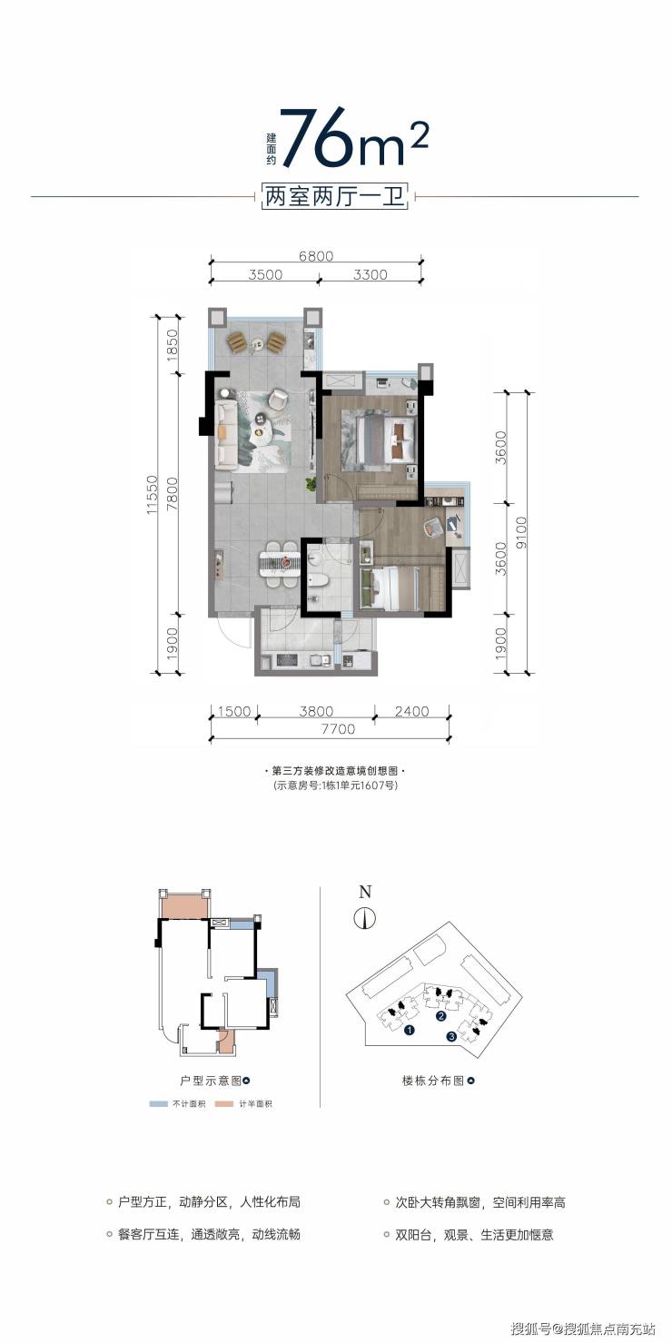 · 76㎡舒适两房(A1):双明卫设计,主卧带飘窗,得房率超80%