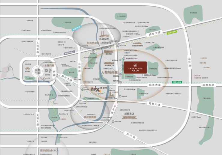 2.地段优势明显:位于成华区崔家店板块,处于万象城东板块,紧邻万象城商圈,与攀成钢、东湖等成熟高端板块相邻,区域发展潜力大。且享有双地铁加持,地铁4号线、7号线经过,加上“三横三纵”路网体系,交通十分便捷。