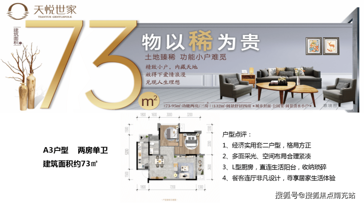 ### 六、户型解析1. **73㎡户型**:这是稀缺的套二户型,无论是投资还是过渡居住都非常合适。户型做到了双面采光,明厨明卫且干湿分区合理。双内飘窗设计十分贴心,飘窗可以拆除,从而增加卧室面积,赠送面积较大。竖厅设计,餐厅与客厅相连,客厅还带有阳台,空间布局舒适。