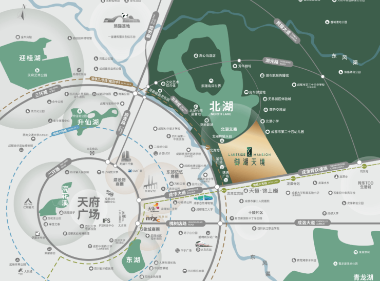 天恒御湖天境不仅拥有优越的自然环境,周边配套同样十分完善。交通方面,项目周边有多条主要道路交汇,地铁8号线二期同乐站近在咫尺,规划中的9号线二期北湖站也将为出行带来更多便利。商圈方面,项目附近拥有星汇广场、锦绣广场等多个商圈,同时紧邻北湖三城的传媒、无界和商务三大商业区,购物娱乐一应俱全。此外,项目周边教育资源丰富,从幼儿园到中学一应俱全,为业主子女的教育提供了有力保障。医疗方面,第二人民医院龙潭院区等多家医院环伺左右,为业主的健康保驾护航。