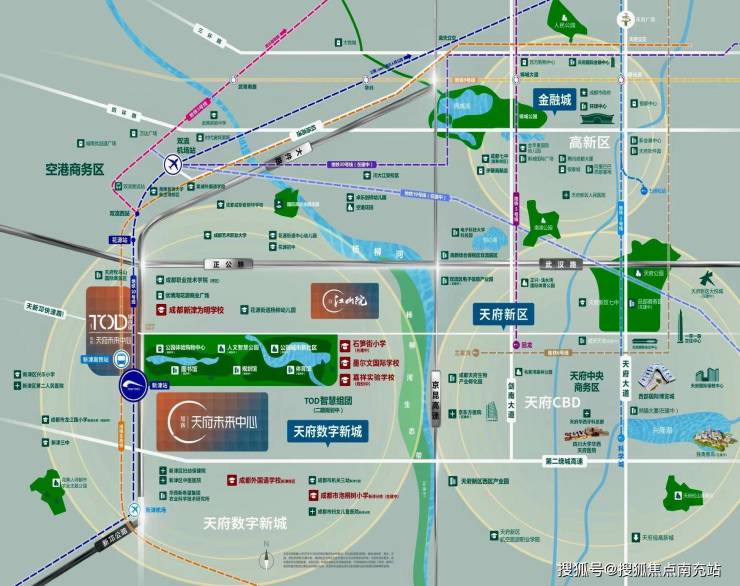 △规划示意图在配套方面,旭辉江山院更是优势明显: - **TOD“137”规划**:繁华生活近在咫尺。“1”代表距离项目 100m 处,有 10 号线地铁站、高铁站以及超级甲板连接的 30 万方购物中心,便捷交通与丰富商业资源就在家门口;“3”指 300m 范围内有文体三馆(图书馆、体育馆、规划馆)等城市配套设施,满足您的休闲与文化需求;“7”表示 700m 半径内项目周围 K12 名校教育资源环绕,涵盖幼儿园、小学、初中、高中的全龄段名校阵容,如石笋街小学新津校区(已开学)、为明学校、墨文国际学校、机关三幼牧山园区(已落地),成都嘉祥天府牧山校区(已动工)等众多精英名校,一站式解决孩子的教育问题。 - **交通兑现**:作为成都唯一三轨合一的 TOD 项目,交通极为便捷,35 分钟即可通达全城。10 号线距离项目仅 100 米即新津站,5 站直达双流机场,未来还可直达人民公园;2023 年 10 号线将实现与 19 号线无缝换乘,9 站就能抵达天府新区;30 号线换乘后可直达金融城(预计 24 年底通车)。此外,路网发达,正公路、武汉路 22 分钟可直通天府 CBD。 - **商业兑现**:约 30 万方商业中心,如同城南太古里一般,“用心营造美好生活”,助力城市发展,为您带来丰富的购物、娱乐、休闲体验。