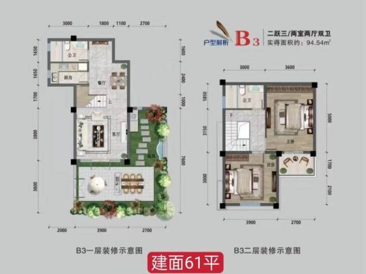 二楼:51-61平,实得80-90平,套二95-105万