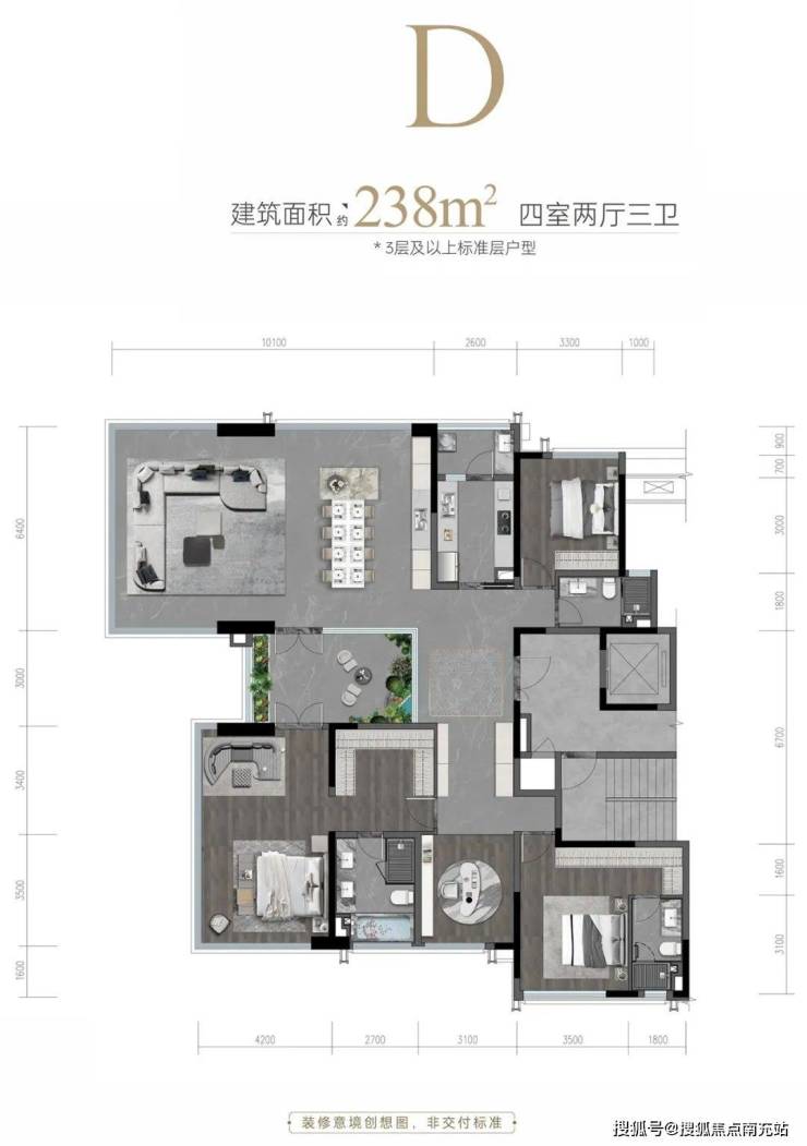 建面约238㎡户型位于楼王位置,拥有小区最强景观和楼间距,单元入户空间比很多楼盘大一倍左右。该户型还是区域内“首个客厅/主卧双全景舱 + 空中院落的设计”,将青羊乃至大城西的产品调性提升至成都TOP级水准。不过此户型数量有限,较为稀缺。