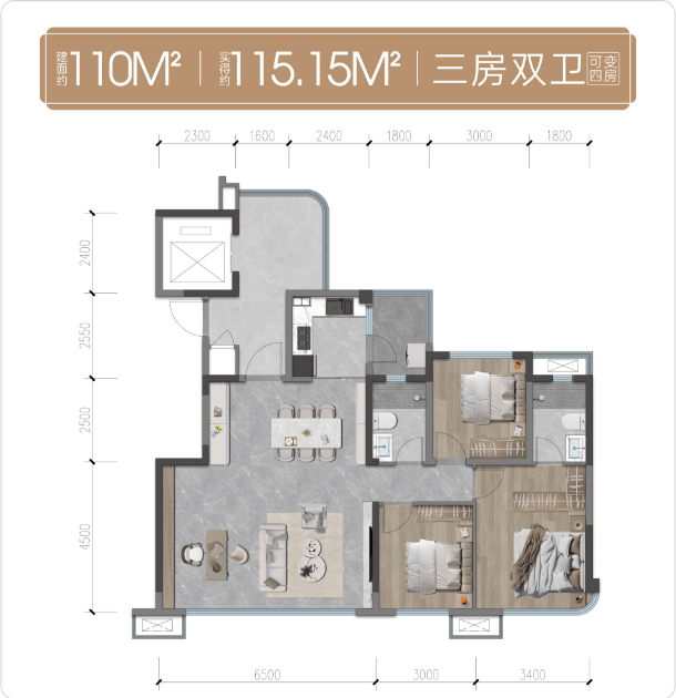 建面约110平套三