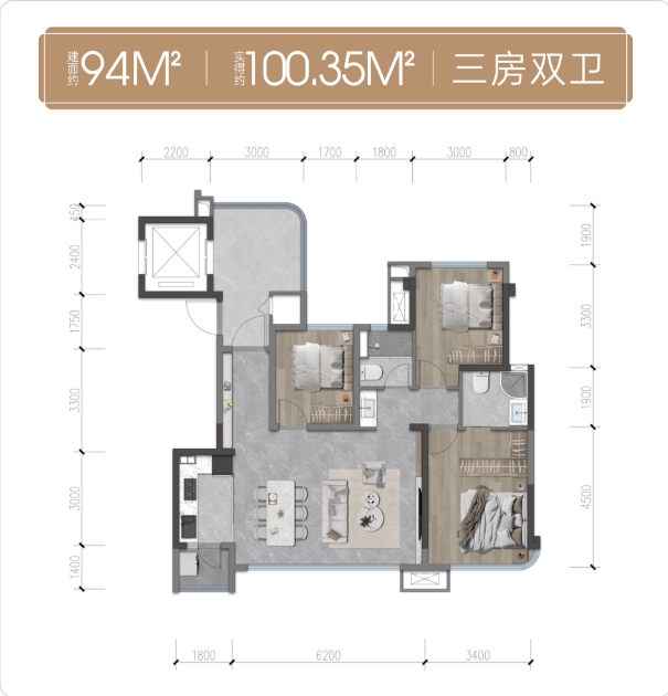 建面约94平套三