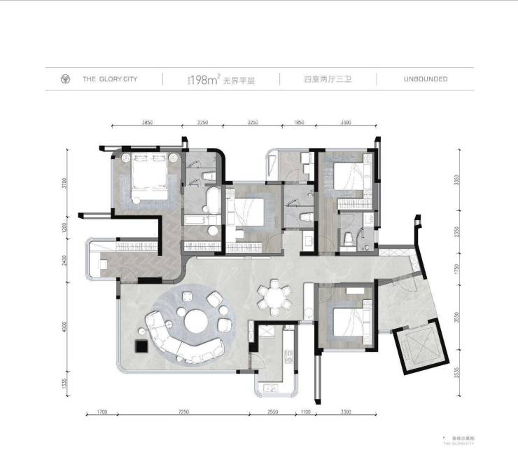 项目主力户型涵盖135-198㎡三至四房,空间布局科学合理,采光通风性能优越。其中198㎡四房三卫户型采用LDK一体化设计,主卧套房配备独立衣帽间和卫浴,充分满足高端改善需求。