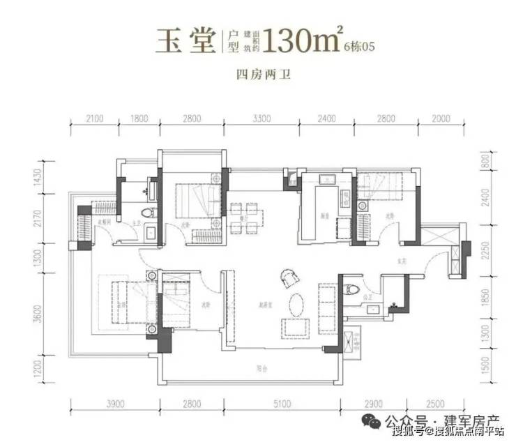 130㎡的4房2厅2卫,设计的是竖厅南北通透格局,进门独立玄关,客厅5.1米开间,客餐厅分离化设计,主卧270°无柱转角飘窗+衣帽间,分别做到了主卧23.66㎡/次卧11.2㎡/次卧8.96㎡/次卧7.84㎡(包含墙体飘窗),U型厨房烟道外置,卫生间干湿分离,得房率约101.95%(包含赠送),客厅连接次卧出超大阳台约14.09平,东北朝向。