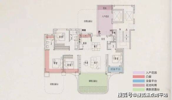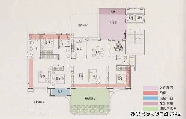 •127㎡四代宅:综合使用率约116%-120%,相当于180㎡独梯独户大平层;南北双花园,奇数层4个、偶数层3个外挂!(2个露台、入户花园、阳台);双主卧设计,户型代际升级;5.6米超大客厅,4+1房可变空间;层高3.15米;