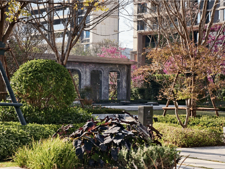 走在其间,能够明显感觉到,不同于常规社区以绿量取胜,天琴樾更注重树种价值、树龄价值与文化寓意价值,以四季有花、步步成景的造园匠心,营造出层次丰富的诗意场景。
