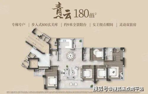 建面约 180㎡ 五房两厅三卫:头排楼王户型,五开间朝南,9 米天幕宽景阳台,70㎡社交大通厅,双南向主卧套房,主卧配女王级衣帽间 + 双台盆主卫,实得空间堪比市面 240㎡户型,总价约360-390 万起。