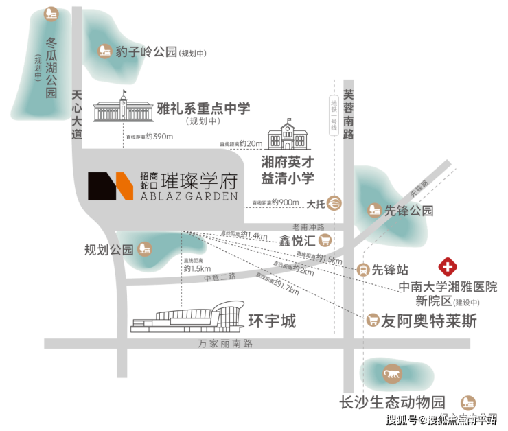 天心的整体建设,沿着天心大道(自天心中心-新开铺板块-黑石铺板块-解放垸板块)高速向南发展。而璀璨学府项目地处天心向南的关键枢纽处,北邻省府、西邻黑石铺及解放垸、南临中信商圈、东临红星,距离奥体中心(规划中)直线距离仅约3公里,享受成熟板块配套利好以及规划板块的未来红利