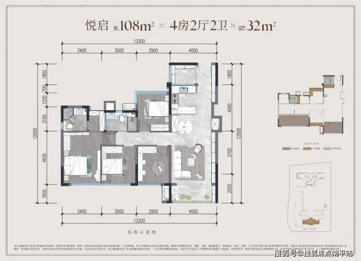 入门级建面约108㎡四房户型,四开间朝南向,动静科学分区,创新的S墙提升收纳,入户处有一个弹性空间,拓展功能多样。约4米宽客厅衔接约1.6米进深阳台,主卧套房约3.4米开间,公卫都有六个平方。市面上的108㎡客厅开间仅约3.6米,虽也能4房2卫,但主卧很少能做到这个尺度,有些为了空间甚至省去了晾晒功能。