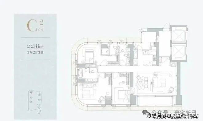 1C栋(1栋三单元)-51层 : 4梯3户 ,约 210㎡ ,为一期的入门级户型,一层三户。