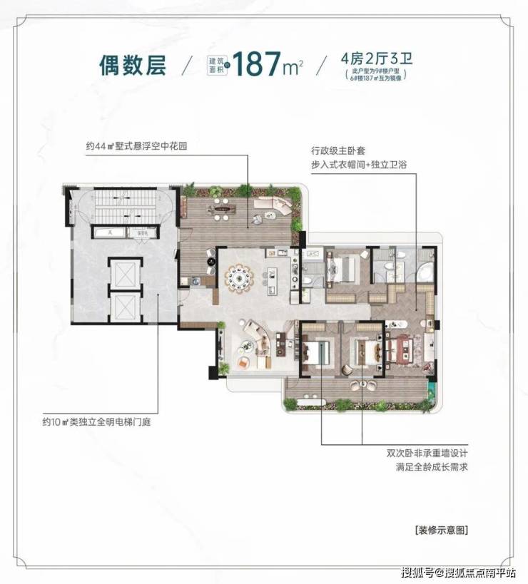 以别墅级逻辑重构平层,打造 139-352㎡四代宅空中院墅,拥有 T1/T2 顶奢圈层、南北双庭院等优势,综合使用率超 110%,实现 “墅式空中庭院生活”。