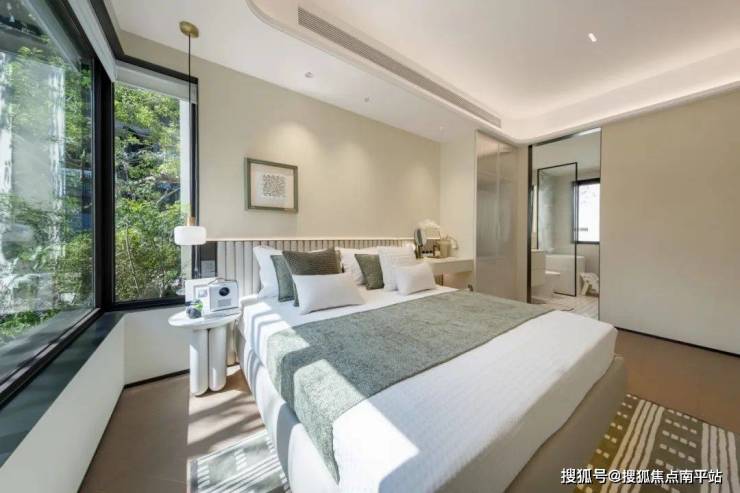 其次,270°转角窗的独特设计。例如, 建面约89㎡户型(边套)约4.7米进深套房式主卧,配置270°转角窗,视野更加开阔,可拥享堪比140㎡以上户型主卧的自在体验!在这里,舒享阳光SPA或欣赏楼下园林景致,惬意十足。