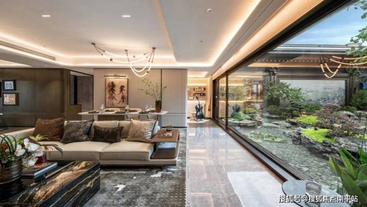 7栋楼围合式布局,以东方内蕴,结合当代前沿审美,打造湖境美学作品;园林上,融入“儒门、道园、唐风、华纹”的新中式匠造理念,打造三进归家礼序,将游园景观与新中式山水园林相融合,敬呈东方王府风范。