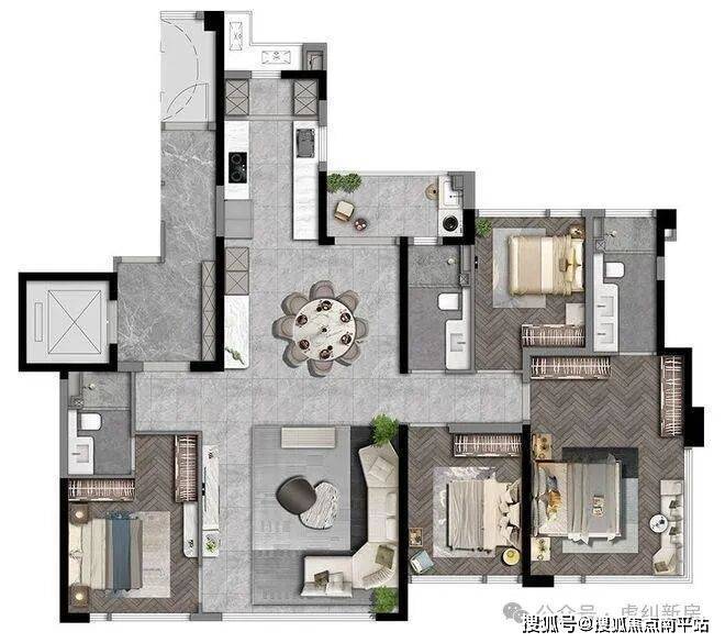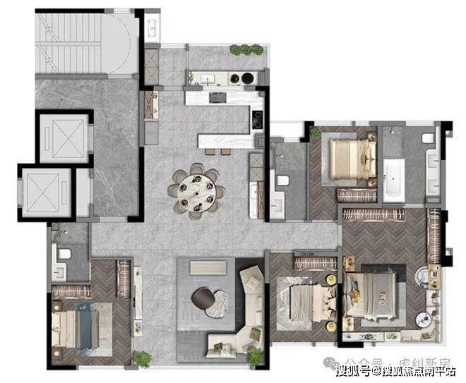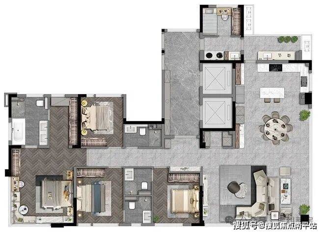 186㎡户型,主卧配置浴缸、双台盆设计、办公书桌,按照酒店式套房来设计。加上转角飘窗,犹如五星级酒店体验感。