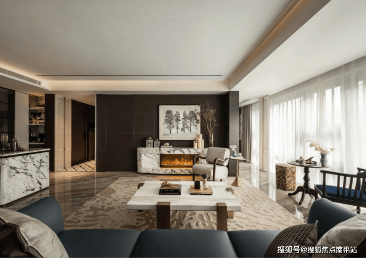 LDKB餐客厨一体化设计,让各个空间融合贯通,增加了家庭的互动性,不设限的空间格局 。客餐厅回风口装饰 、厨房石英石台面项目专属图腾,均为客户定制产品。