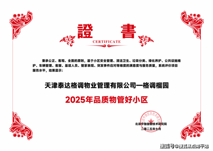 本次报告会不仅总结了2025年上半年房地产市场,更是通过数据深度探讨了AI时代物管行业的发展,并对“好小区”研究与网络评选结果进行发布,格调榴园荣膺“2025年品质物管好小区”殊荣,成为天津高端住宅的品质标杆。