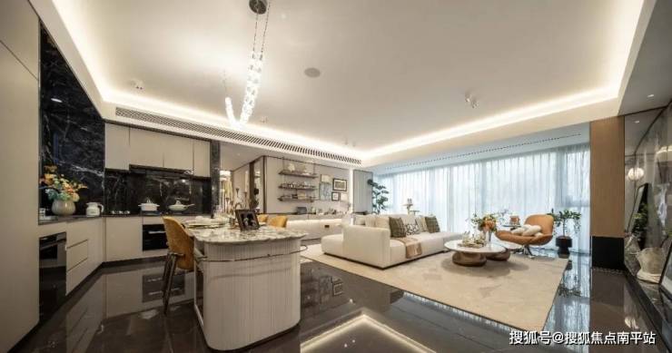 进门玄关保持隐私性后,映入眼帘的就是餐客厨一体近60㎡,餐厅可以放下6人长桌,满足聚会交友需求。