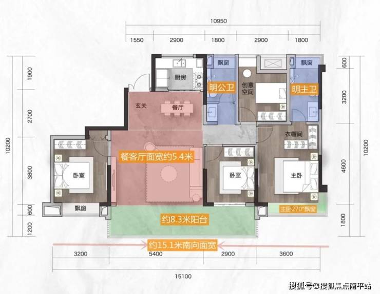 并且,厨房、公卫、主卫都是带有窗户,明亮通风;其中主卫也有270°飘窗,可以根据自己的需求设计成休闲空间。