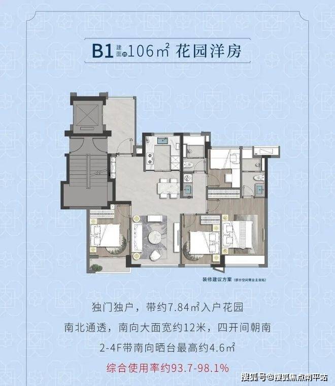 虽然非第四代住宅,但是2-4F同样具备第四代住宅的空中花园元素,赠送入户花园约7.8㎡、2-4F赠送露台约4-7㎡、赠送凸窗及设备平台约7㎡,全屋赠送面积约20㎡,实现接近负公摊的居住效果。更是做到了四面宽朝南。