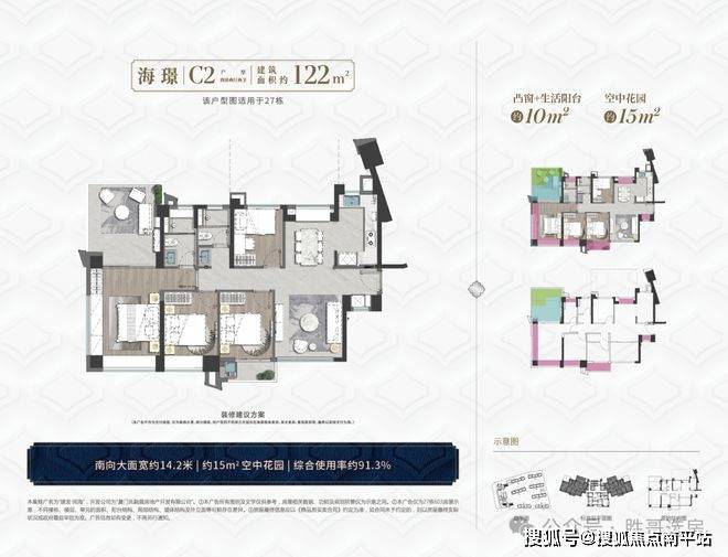跟124㎡洋房一样,在北侧观海面设置了全赠送的景观空中花园,面积达到约8-16㎡,使得高层也实现了墅居梦想,凸窗及设备平台赠送约10㎡。