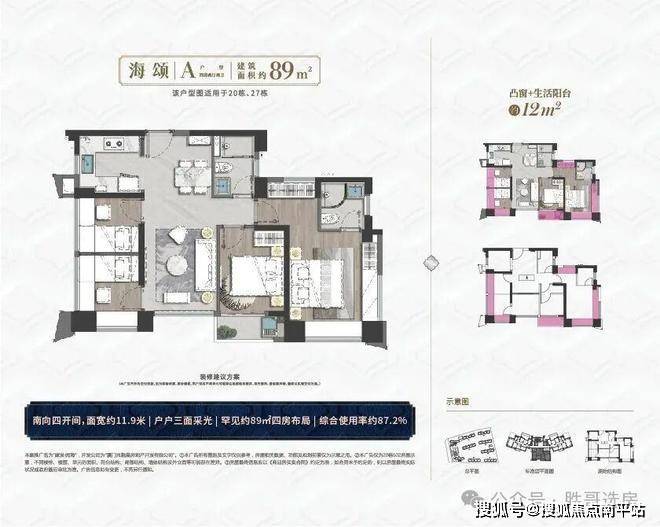 ▷ 89㎡四房四面宽朝南,岛外唯一90㎡内全明四室,赠送面积达12.6㎡