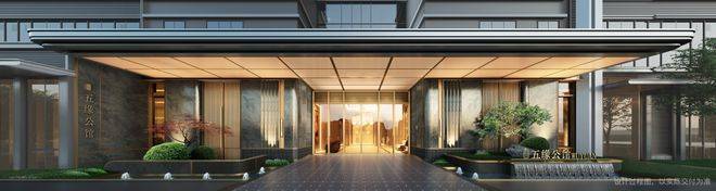 超长的铝板门檐和透光穹顶,搭配奢感十足的石材照壁和大面玻璃门,配以“五缘公馆”字样的喷泉水景,寓意风生水起,归家的每一次体验,有面子,也有里子