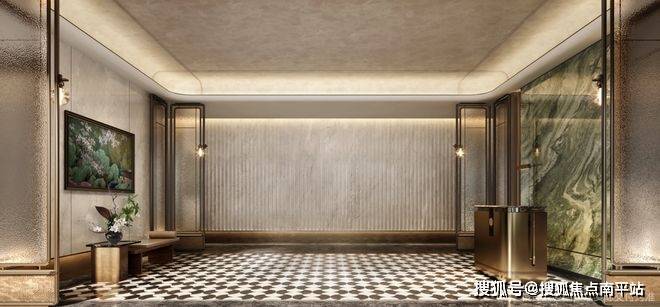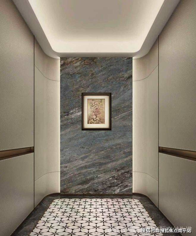 对齐当下岛内6-7万的高端新房采用的设计:豪宅同款的拼花地砖、大面的奢石背景墙、棕金框水波纹玻璃屏风、天鹅绒艺术漆打造的吊顶和天花、镌刻精美纹路的电梯门……一眼看过去,就是豪宅的感觉