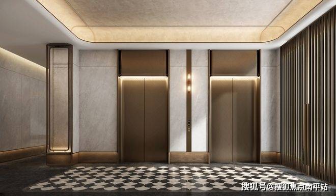 电梯厢也同样豪华!皮革包裹的厢体,环形灯带与弧形吊顶,搭配一整面的仿奢石岩板,在柔和的暖光映照下,营造温馨又高级的氛围
