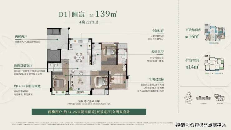 全线户型采用三至五开间朝南设计,南向面宽约12.4-17.5米(含墙),大幅领先于市面上同类产品, 如建面约128㎡,超15米南向四开间,四面宽朝阳,实现了同面积段罕见的极致采光与通风效果,显著优化了居住舒适度。