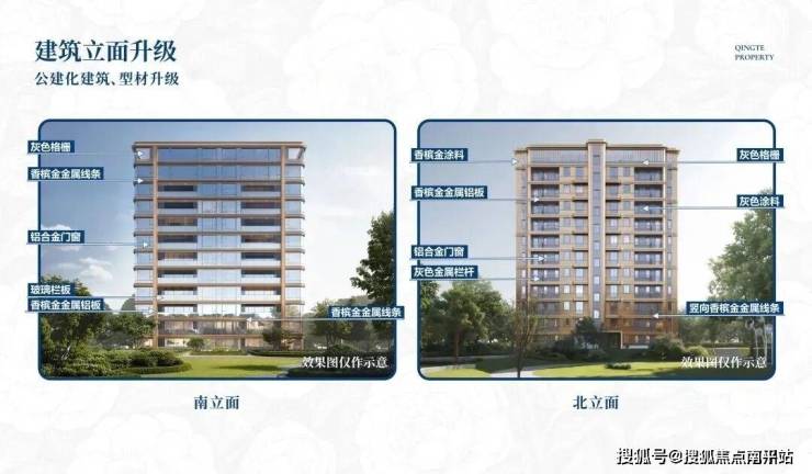 建筑立面采用南向铝板+LOW-E玻璃,搭配香槟金色金属线条,整体轻盈现代,充满镜面艺术感。