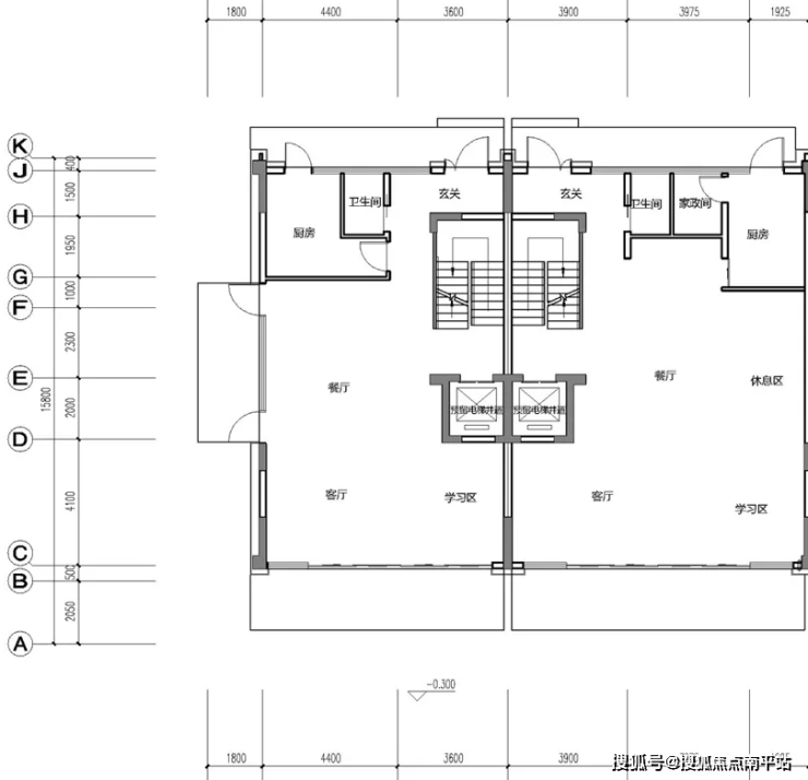 洋房B1#标准层的户型图如下↓,一梯两户设计。