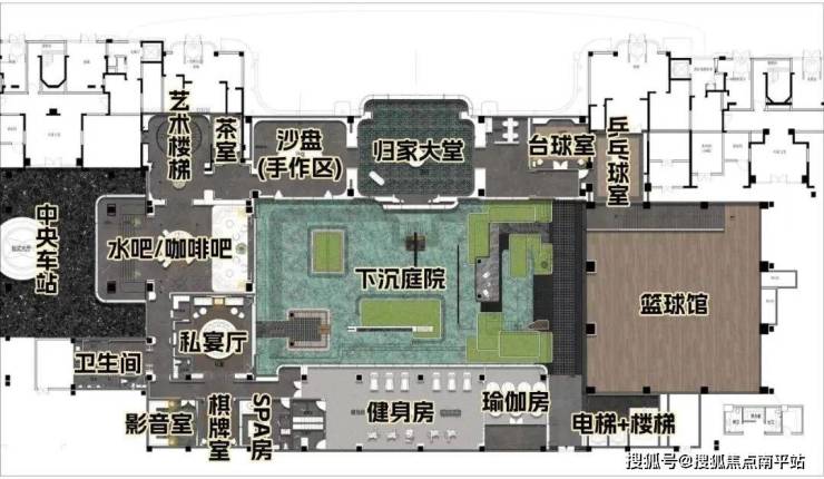 围绕着中央下沉庭院,金茂居然预设了12个功能区。除了常见的健身房、瑜伽室、棋牌室、水吧会客区、茶室,还有私宴厅、观影室、SPA房、台球室、乒乓球房,甚至篮球馆。
