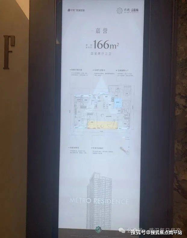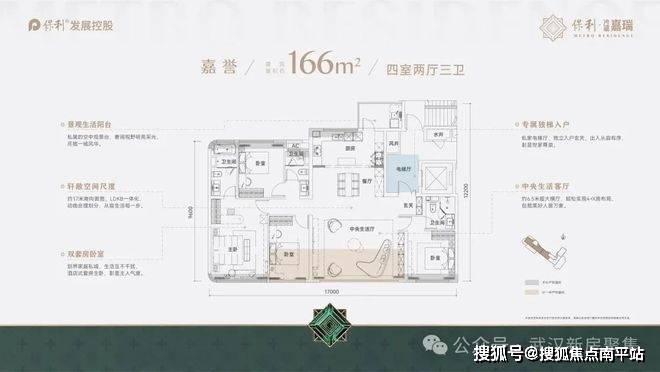 该户型位于西边端头和单元拼接处,也是该盘主力户型,每层分布有3户。户型带独立电梯前室,也是相对传统的南北朝向结构,166平做了3个卫生间,功能性是不错的,不过次卧带的是暗卫。客厅和南向次卧部分为阳台优化面积,其他空间为飘窗优化面积,厨房北侧带了一个X空间,具体怎么算面积需要现场咨询。
