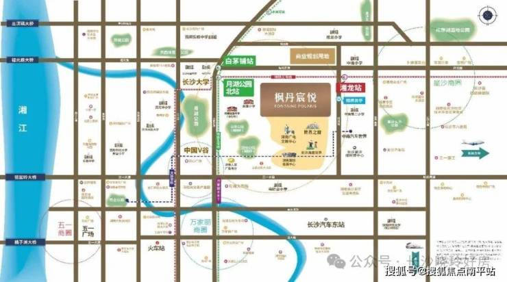 地铁:地铁3号线湘龙站与规划的8号地铁站换乘(约300米),五号线白茅铺站(约1公里),