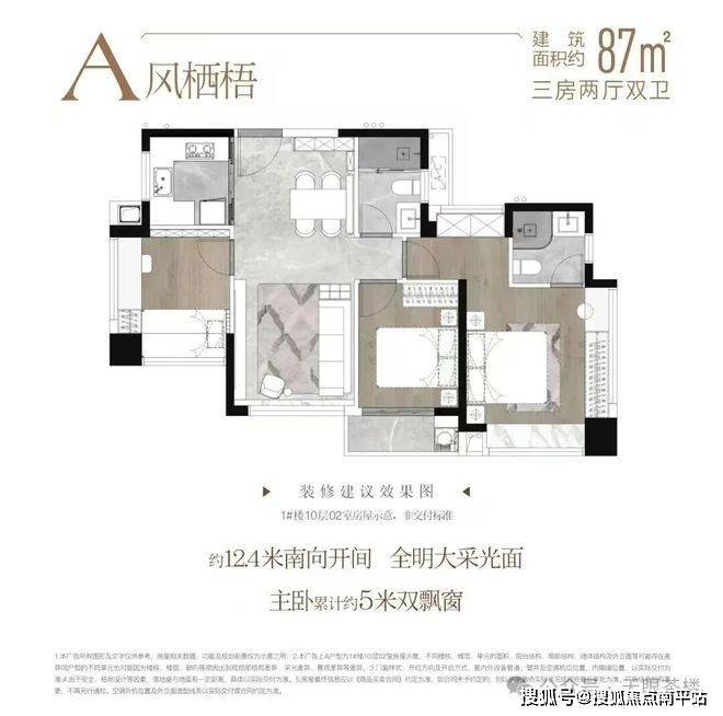 1.全2梯3户,套内综合使用率高达87%-89%